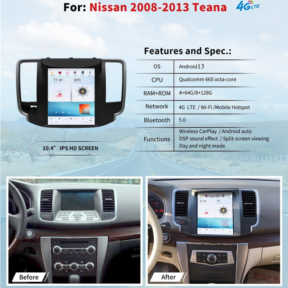 10.4" For NISSAN Teana 2008-2013 Car Radio Headunit Stereo Carplay Upgrade Tesla Style Screen Android Auto GPS Navigation Multimedia Player