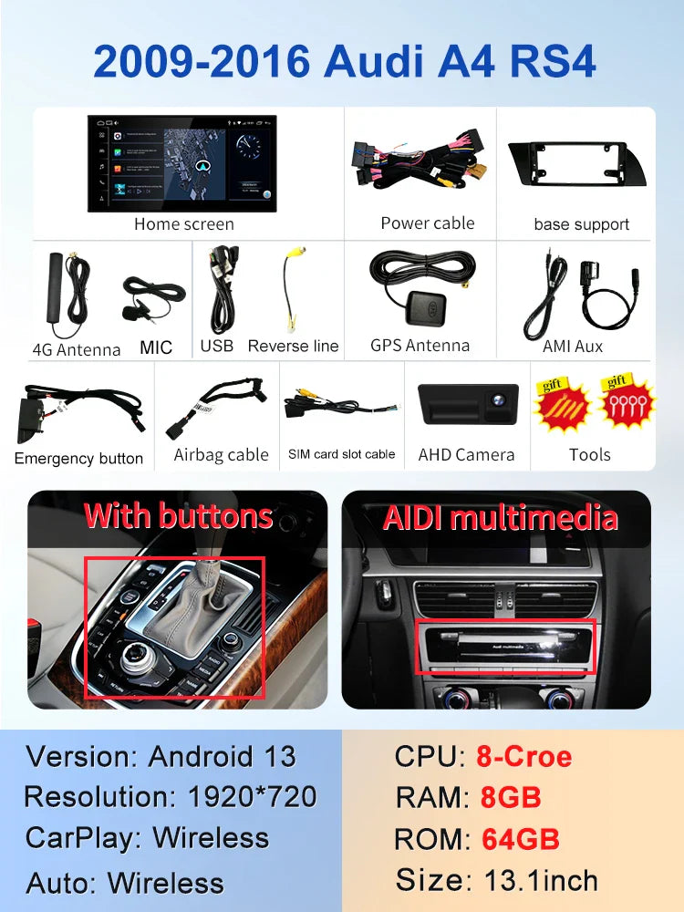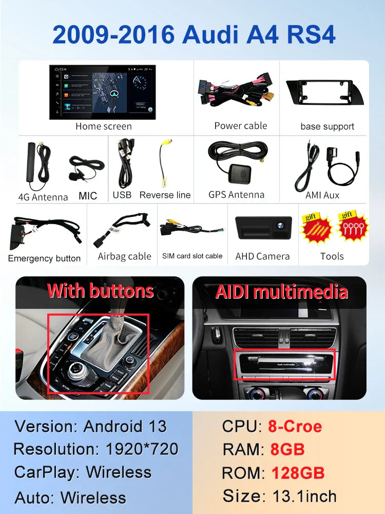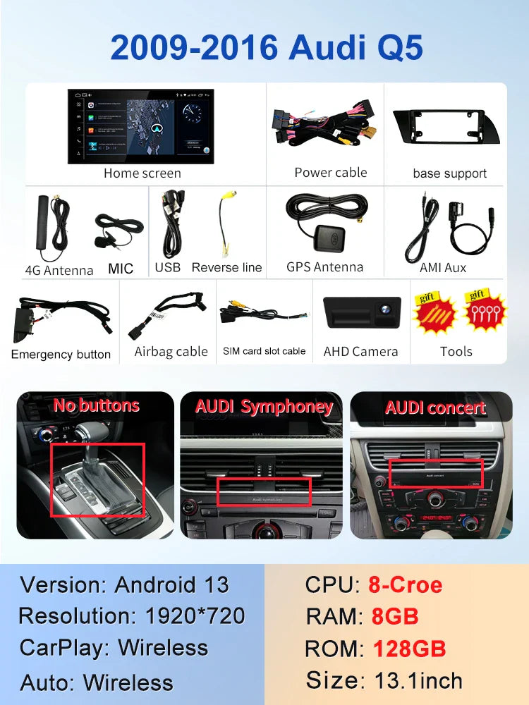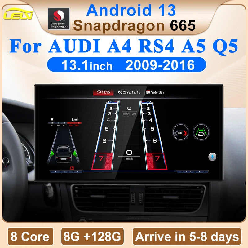 2024 New Qualcomm Snapdragon665 Android13 Wireless AUTO Carplay For AUDI A4 A5 B8 Q5 Car Video Players GPS Navigation Multimedia 13.1inch Screen