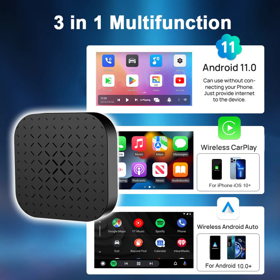 Tbox-Basic ai box adds Android 11 system which comes with YouTube Netflix Tiktok Disney,support watching online video in the car.and support wired CarPlay to wireless CarPlay and wireless Android Auto ,Compatible with iPhone iOS 10+ and Android phones Android 11 +