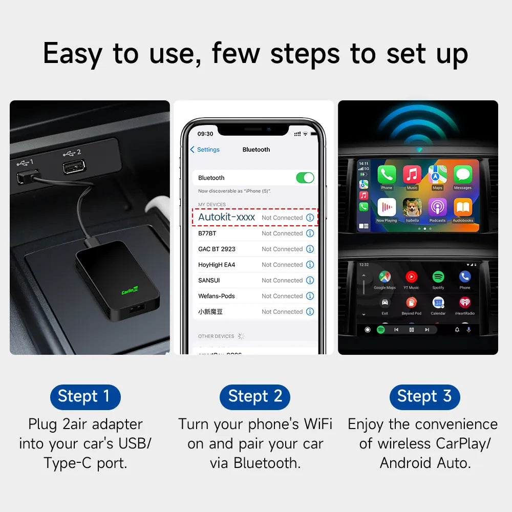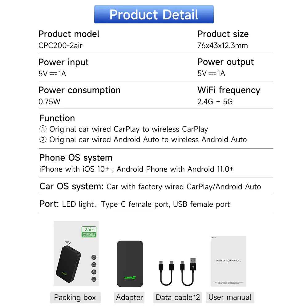 The CPC200-2air wireless Adapter provides a wireless connection to your car's existing Android Auto-capable or wired Apple CarPlay infotainment system, making it even easier to get all your favorite maps, media and messaging apps on your car display simply via bluetooth and wifi connection .