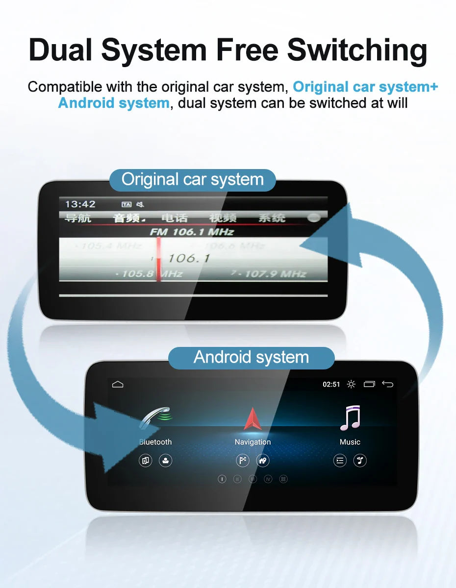 The DMP Android Command system elevates Mercedes-Benz vehicles with an enriched entertainment experience, an array of innovative features, and a refined aesthetic, seamlessly integrating the essence of newer generation Mercedes designs, all while preserving the vehicle's original functionalities.