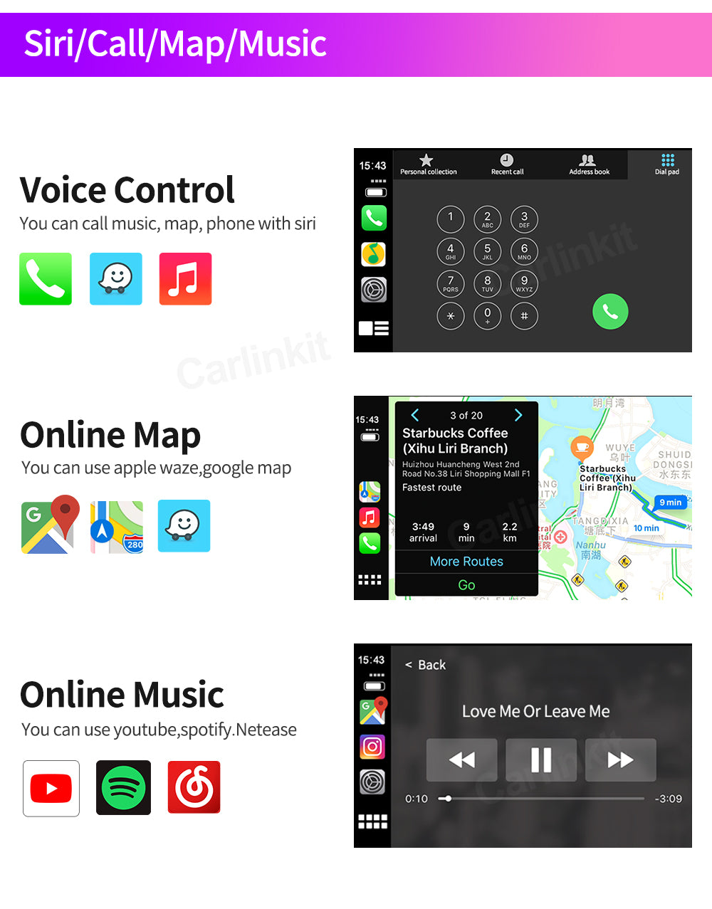 Whether your head unit system is factory-equipped with navigation, phone module or Bluetooth, whether it's Apple Maps, Spotify, making/receiving calls or using Siri to reply to text, the system fully supports Apple systems and phone features.